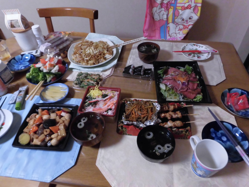 Uutena vuotenakaan ei oikein muuta tehty kuin syötiin. Perheen äiti lähti aattoaamuna näiden mummolle, ja on siellä kolmanteen päivään asti, joten vastuu aattoillan päivällisestä meni perheen isälle ja Kengolle, ja vietettiinkin useampi tunti ruokakauppoja kiertäen - kuten ihmismäärästä päätellen aika moni muukin näytti tekevän. :D Valitsemisessa oli haasteensa, varsinkin kun en oikein tiennyt mikä sopisi uuteen vuoteen, mutta saatiin loppujen lopuksi kerättyä kokoon ihan kiitettävän runsas päivällisateria. Varsinkin kun perheen isäkin oli hoitanut oman osuutensa mallikaasti, ja ostanut pöytään muun muassa yakisobaa sekä jonkinlaista lihaa ja tuonut näiden mummon tekemää kinpira gobouta - joka oli muuten hirveän hyvää, varsinkin kun tykkään kinpira gobousta muutenkin. ♥
